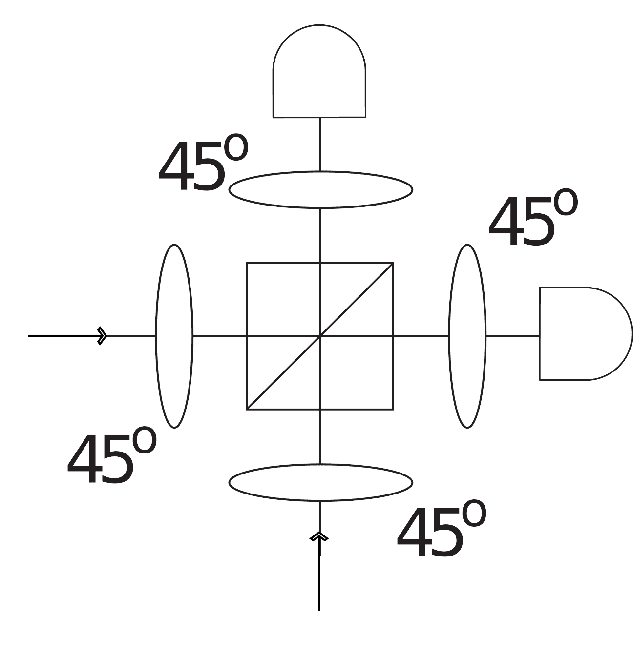 There are various methods how one can manipulate a beam of light - mirrors reflect the beam, lenses focus or defocus the beam, filters let through only certain colors etc. An important optical element is the beam splitter, whose photo can be seen below, which partially reflects and partially transmits the incoming beam. The exact same optical elements such as these can also be used to manipulate single photons. One has to be however more careful when describing the action of these elements - a photon is an indivisible elementary particles and cannot be divided into smaller constituents. For that reason, we cannot say that a beam splitter divides the incoming photon, transmit its part, and reflects the other. Instead, the beam splitter introduces a quantum superposition of two possibilities - either the photon is transmitted, or reflected, in such a way that these two possibilities exhibit interference: the photon behaves in a certain sense as if it was both transmitted and reflected simultaneously.